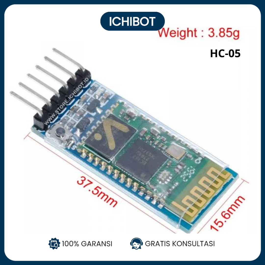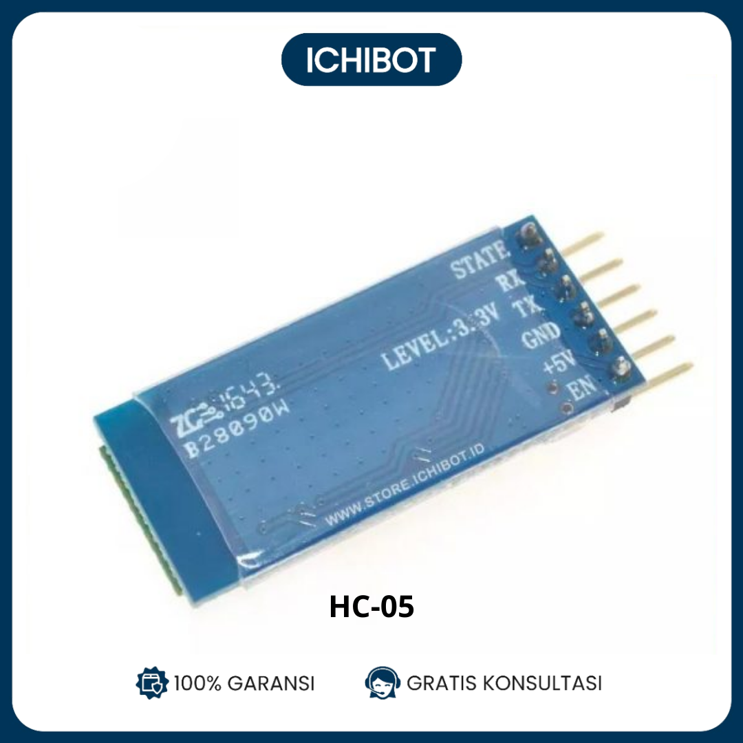 Bluetooth HC-05 adalah protokol komunikasi wireless yang bekerja pada frekuensi radio 2.4. GHz untuk pertukaran data pada perangkat bergerak seperti pada laptop, HP, dan lain-lain. Salah satu hasil contoh modul Bluetooth yang palingbanyak digunakan adalah tipe HC-05. Spesifikasi singkat: Serial Bluetooth module for Arduino and other microcontrollers Operating Voltage: 4V to 6V (Typically +5V) Operating Current: 30mA Range: <100m Works with Serial communication (USART) and TTL compatible Follows IEEE 802.15.1 standardized protocol Uses Frequency-Hopping Spread spectrum (FHSS) Can operate in Master, Slave or Master/Slave mode Can be easily interfaced with Laptop or Mobile phones with Bluetooth Supported baud rate: 9600,19200,38400,57600,115200,230400,460800.